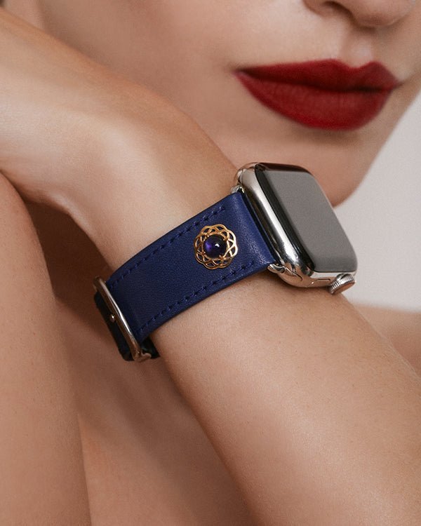 This unique, blue calfskin leather band is adorned with two genuine iolite cabochons set in a 14k yellow gold floral motif. Our leather craftsmen use proprietary technology to seamlessly lock each jewel into the lining to ensure stability.
