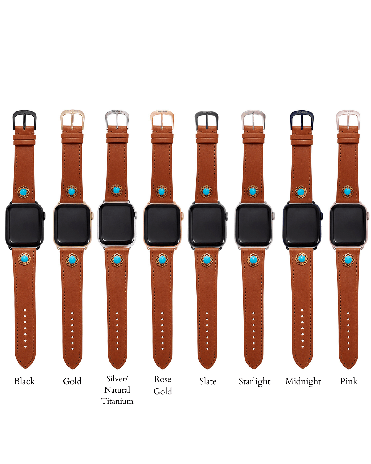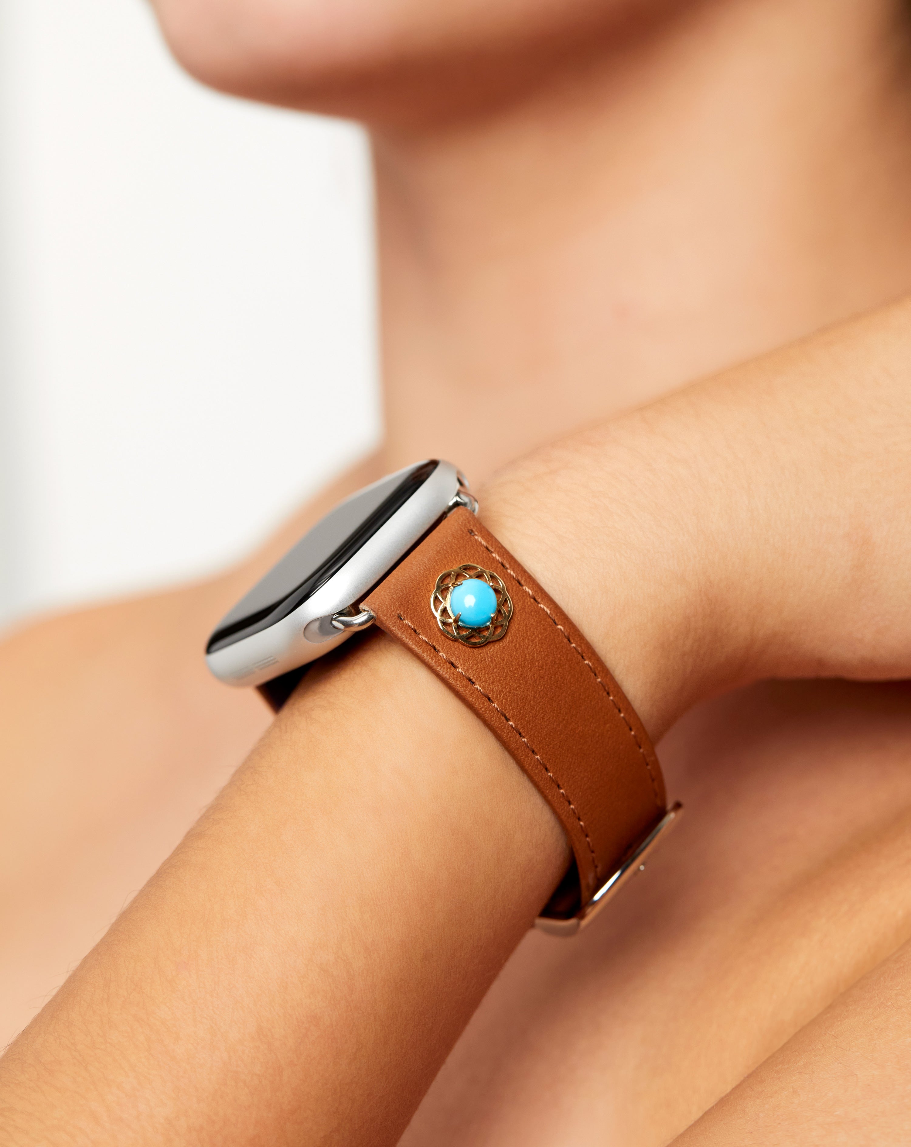 This unique, brown calfskin leather band is adorned with two genuine turquoise cabochons set in a 14k yellow gold floral motif. Our leather craftsmen use proprietary technology to seamlessly lock each jewel into the lining to ensure stability.