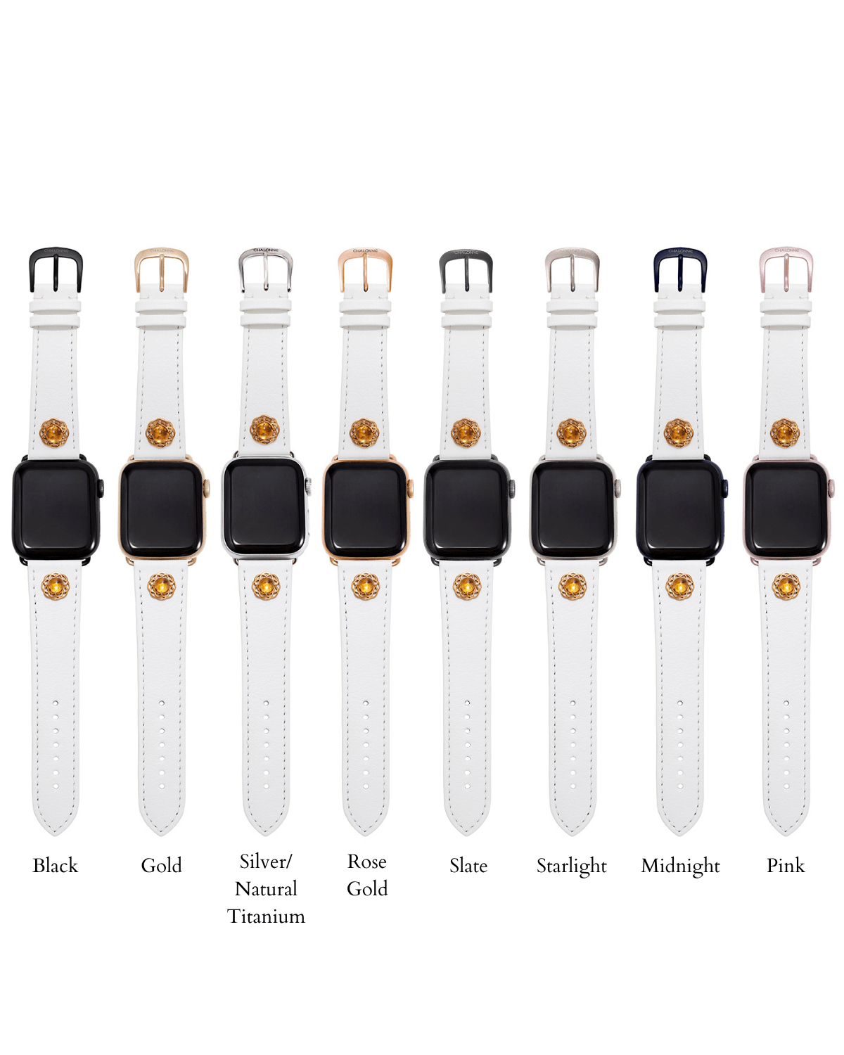This unique, white calfskin leather band is adorned with two genuine citrine cabochons set in a 14k yellow gold floral motif. Our leather craftsmen use proprietary technology to seamlessly lock each jewel into the lining to ensure stability.