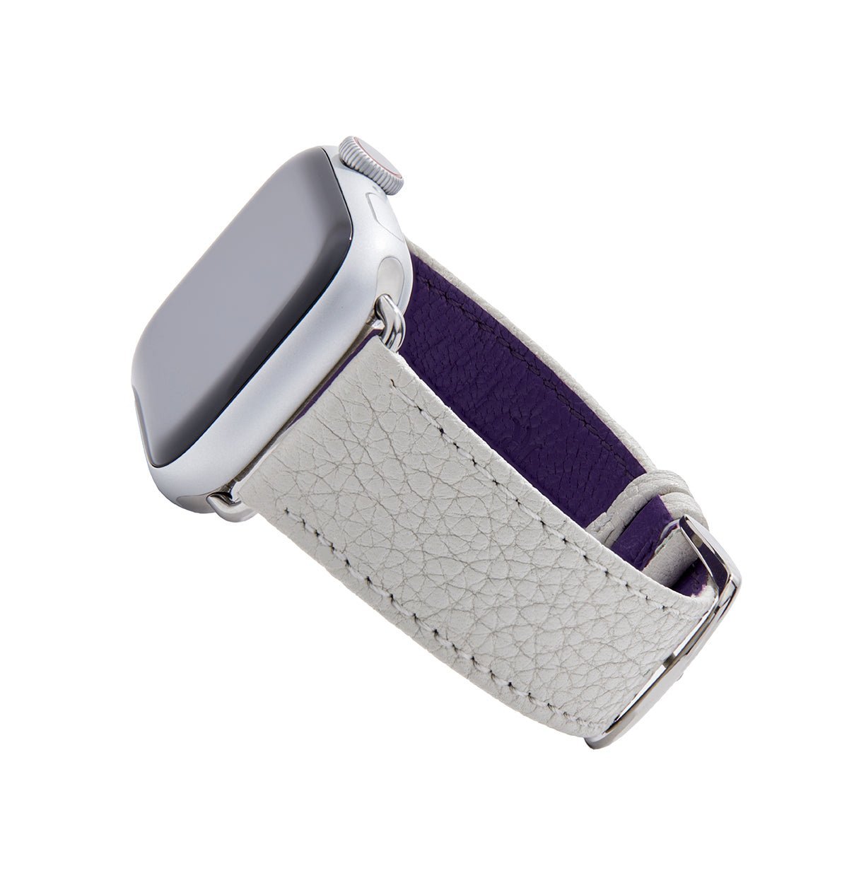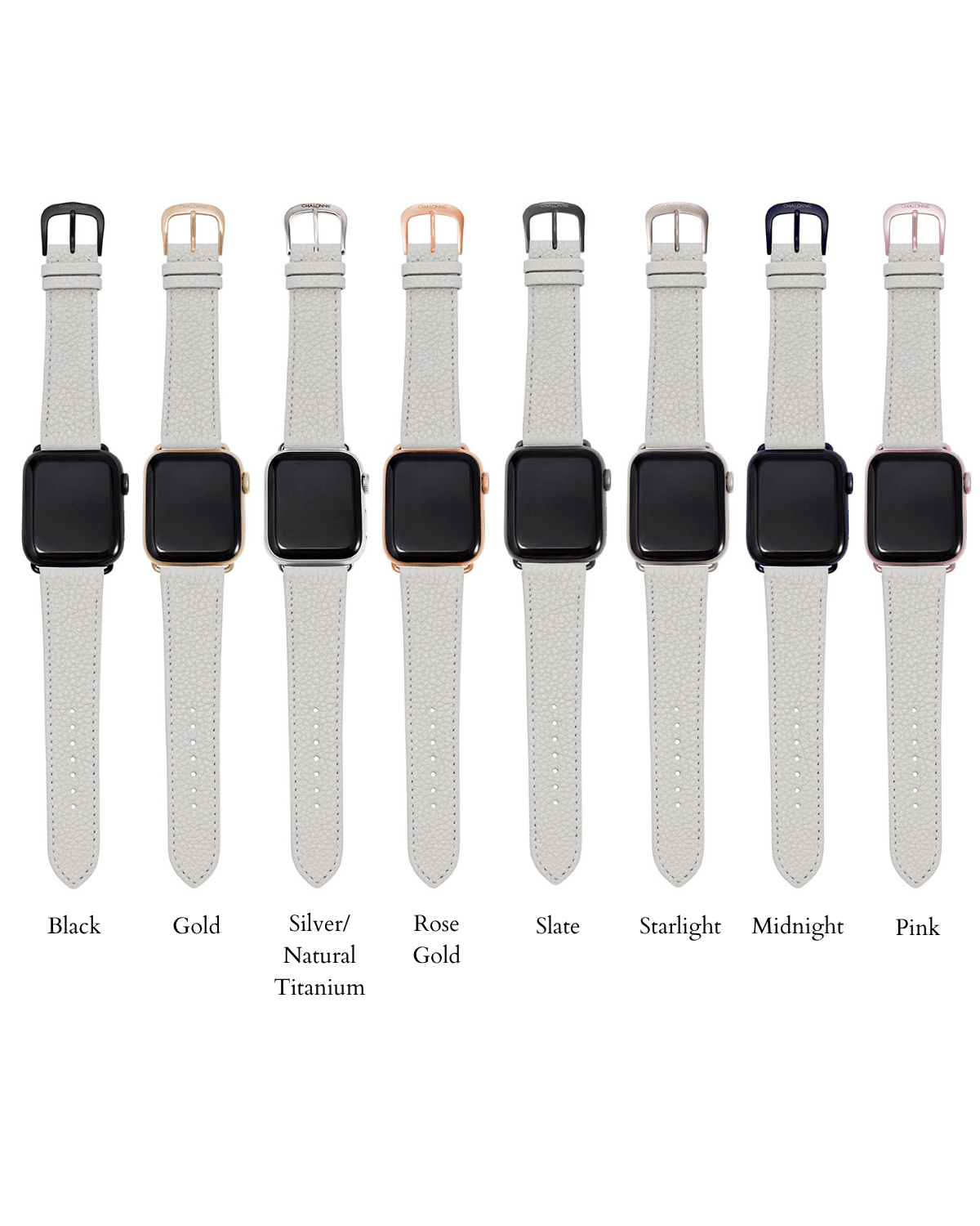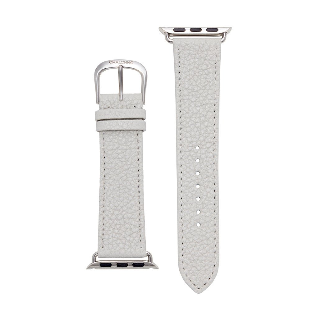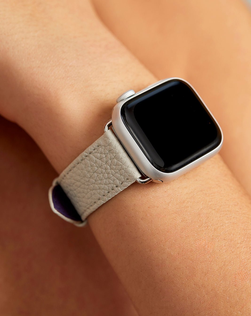 The Gelato in Earl Gray features light gray, pebbled, calfskin leather with coordinating stitching. Each band is handcrafted in France in small batches with meticulous attention to detail, using only the finest quality leather.
