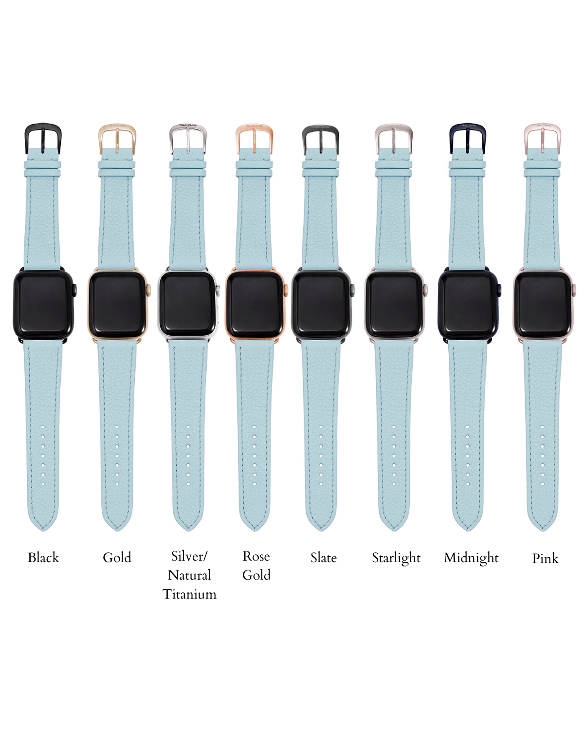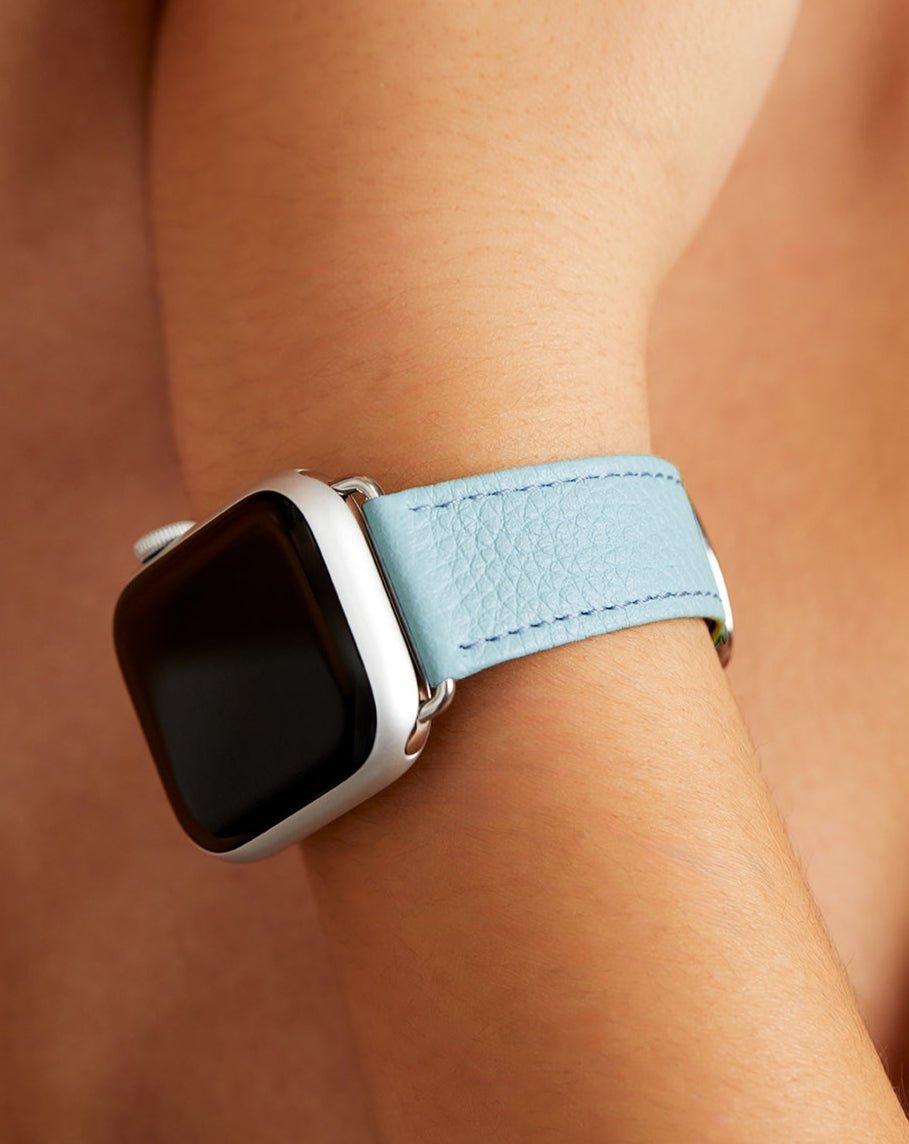 The Gelato in Iced Blue features pastel blue, pebbled, calfskin leather with coordinating stitching. Each band is handcrafted in France in small batches with meticulous attention to detail, using only the finest quality leather.