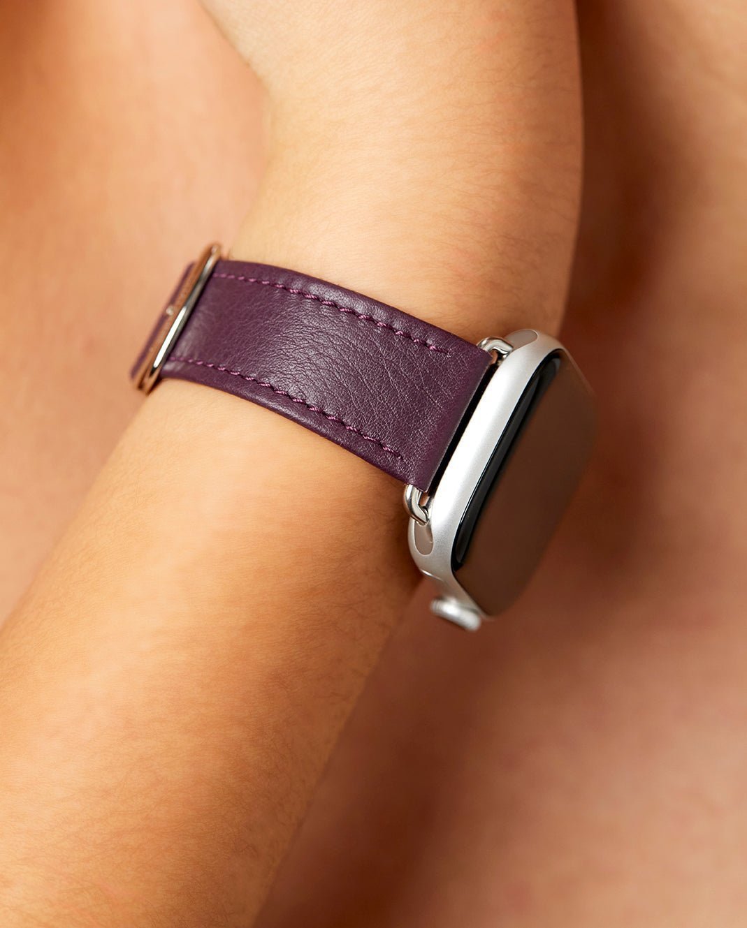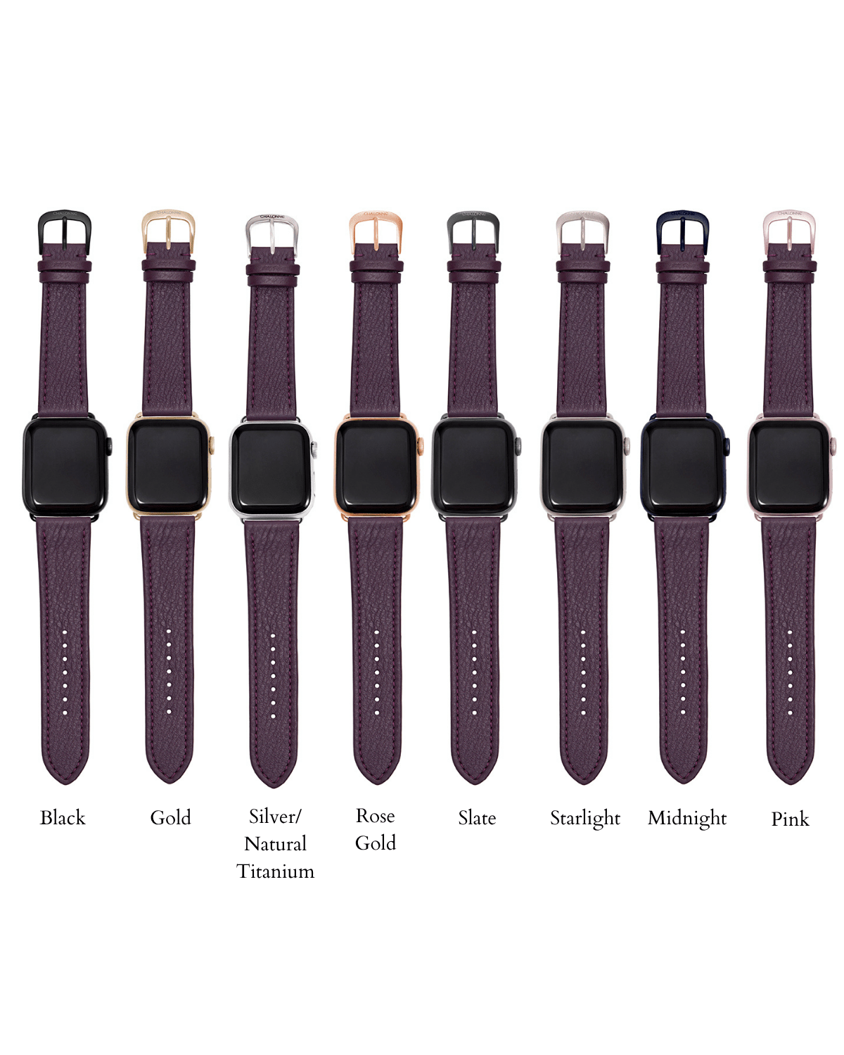 The Sorrento in Aubergine is a deep purple calfskin leather with coordinating stitching. Each band is handcrafted in France in small batches with meticulous attention to detail, using only the finest quality leather.