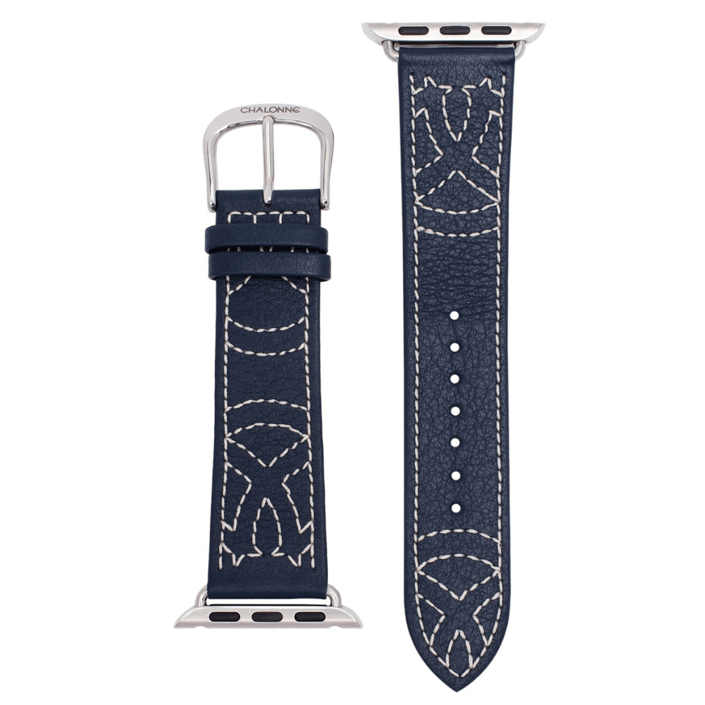 Some of the most simple designs can be the most elegant and our Sedona line is no exception. The Sedona in navy features embroidered stitching on blue calfskin leather, which adds a cool, contrasting vibe. Each band is handcrafted in France in small batches with meticulous attention to detail, using only the finest quality leather.
