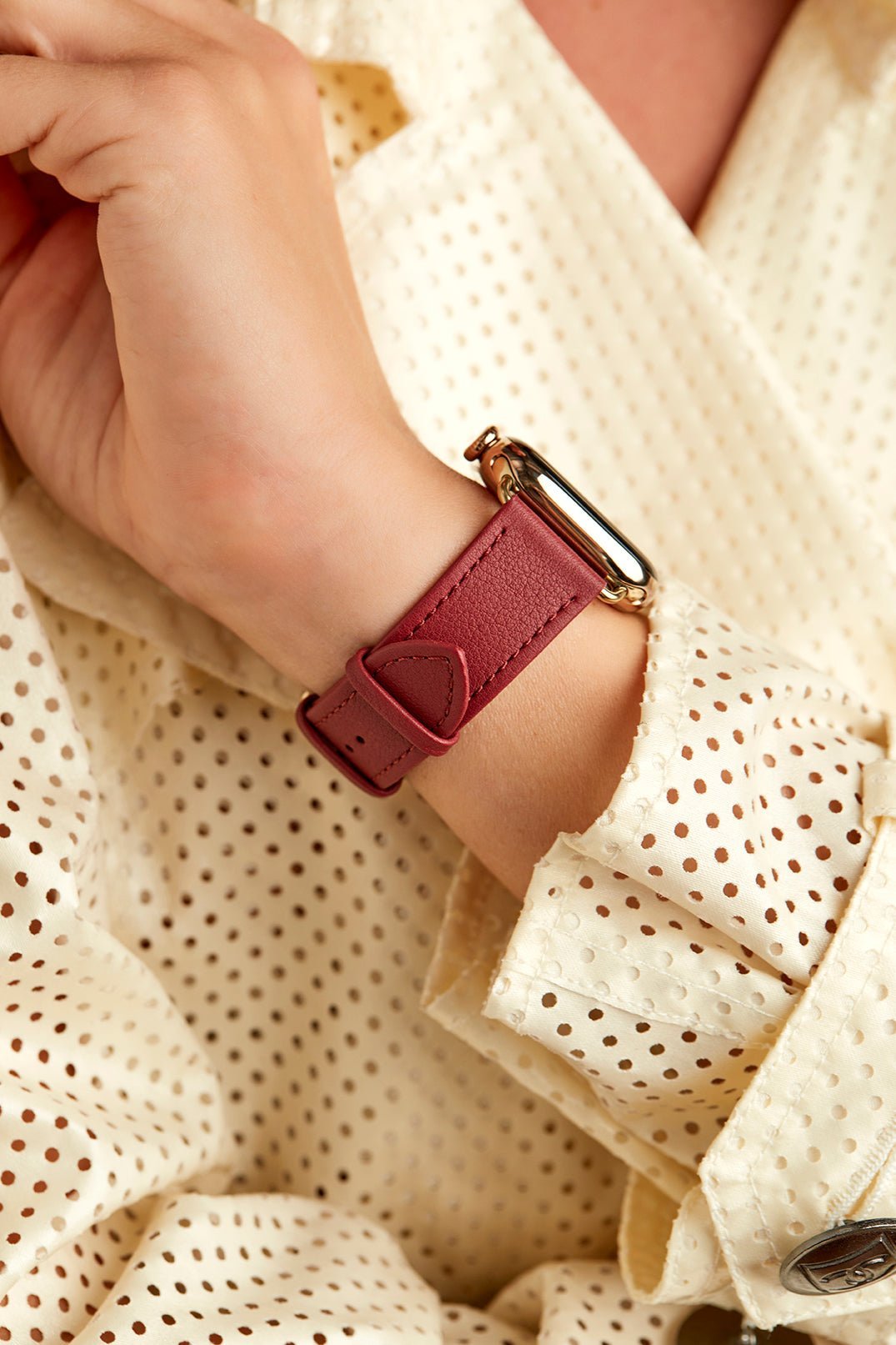 The Sorrento in Rouge is a lovely, brownish-red calfskin leather with coordinating stitching. Each band is handcrafted in France in small batches with meticulous attention to detail, using only the finest quality leather.