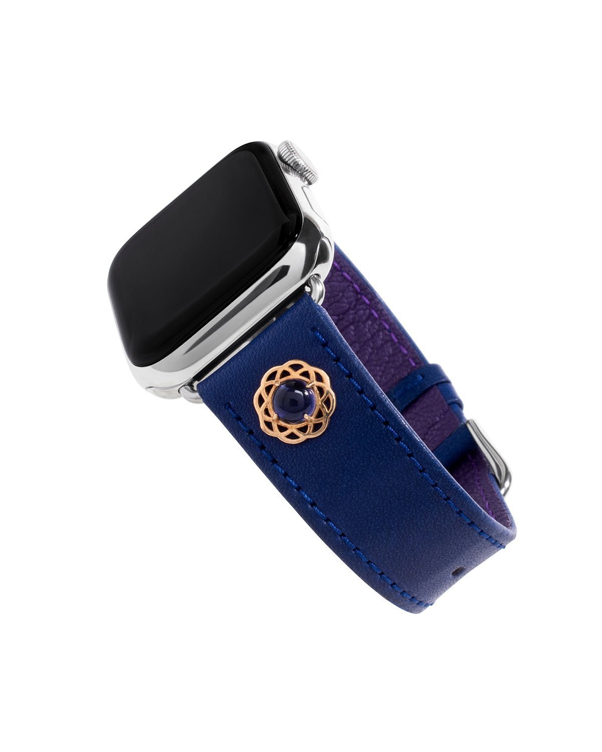 This unique, blue calfskin leather band is adorned with two genuine iolite cabochons set in a 14k yellow gold floral motif. Our leather craftsmen use proprietary technology to seamlessly lock each jewel into the lining to ensure stability.